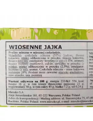 Wiosenne jajka to praliny mleczne z mlecznej czekolady. Duże opakowanie wystarczy na dłużej. Świetne uzupełnienie słodkiego stołu podczas Świąt.